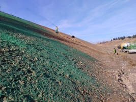 Snažíme se o aplikovaný výzkum a to, co řešíme "po vědecku", přenášíme do praxe. Příkladem takového přístupu je i využití regionální směsi osiv na ozelenění nově vzniklých svahů dálnice u Kaplice. Pokud se vše povede, příští rok budou svahy postupně zarůstat polo-stepními trávníky a vřesovišti. Použité osivo nedoletělo z Afriky, Nového Zélandu, či Holandska, jak bývá běžnou praxí na trhu s osivy, ale bylo šetrně nasbíráno kartáčovacím strojem z vhodných zdrojových luk a lesních lemů, ne víc než 50 km daleko. Udržitelně a ekologicky za technické podpory ZO ČSOP Šumava. Aplikace osiva proběhla hydroosevem tak, aby se na svahu udrželo do té doby, než vyklíčí a prokoření svrchní vrstvu půdy. A mimochodem, v rámci našeho běžícího projektu vyvíjíme i nový, cenově dostupný kartáčovací stroj, abychom tuto technologii podpořili.
